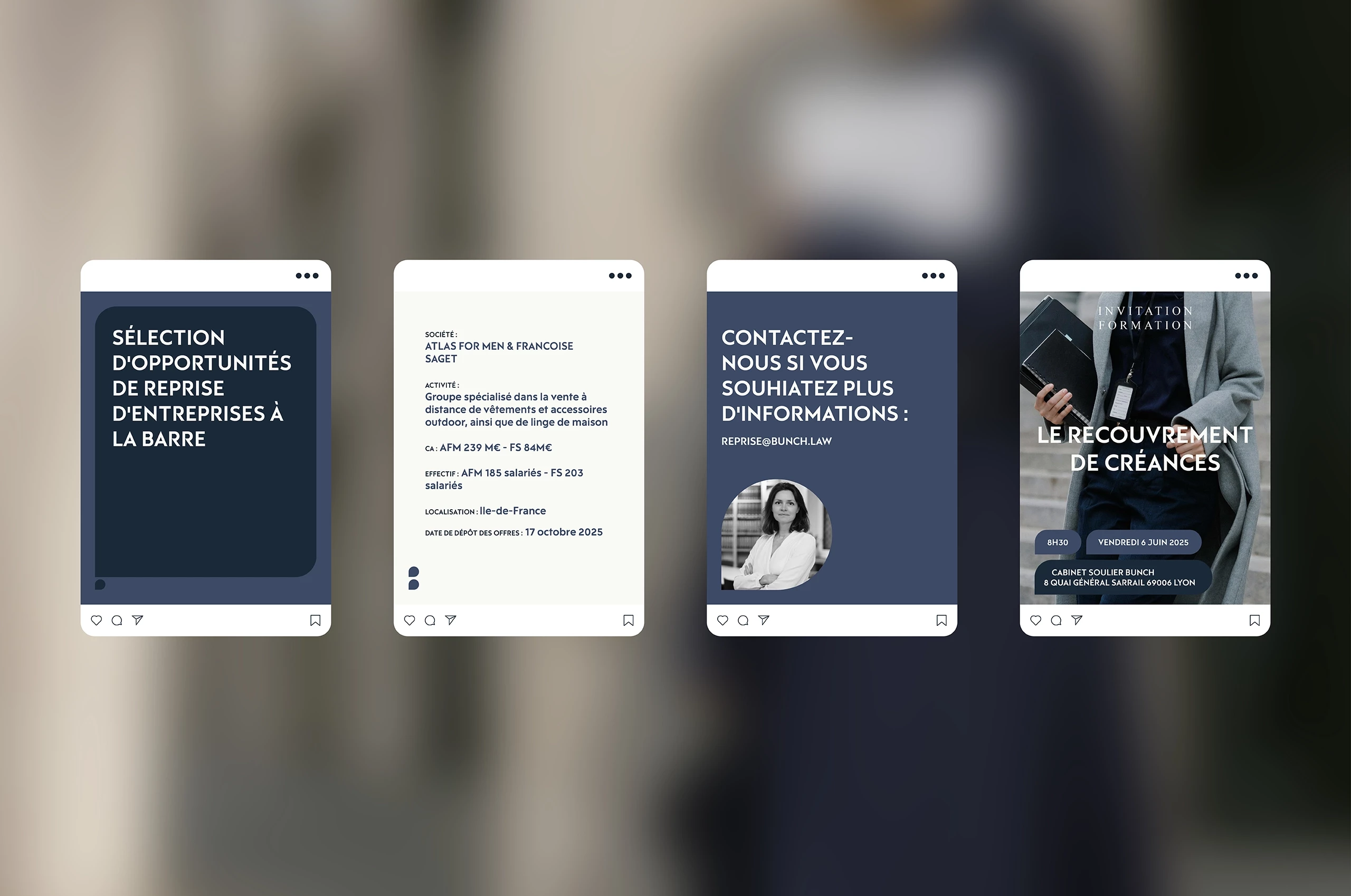 Le bleu grisé, couleur dominante, a été adopté pour son élégance sobre et sa capacité à évoquer la stature, la confiance et la modernité. Cette teinte, à la fois discrète et affirmée, rappelle l’exigence du secteur juridique tout en soulignant la singularité de Soulier Bunch.
